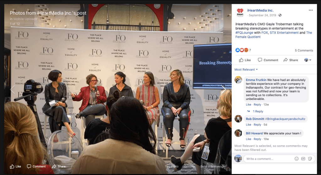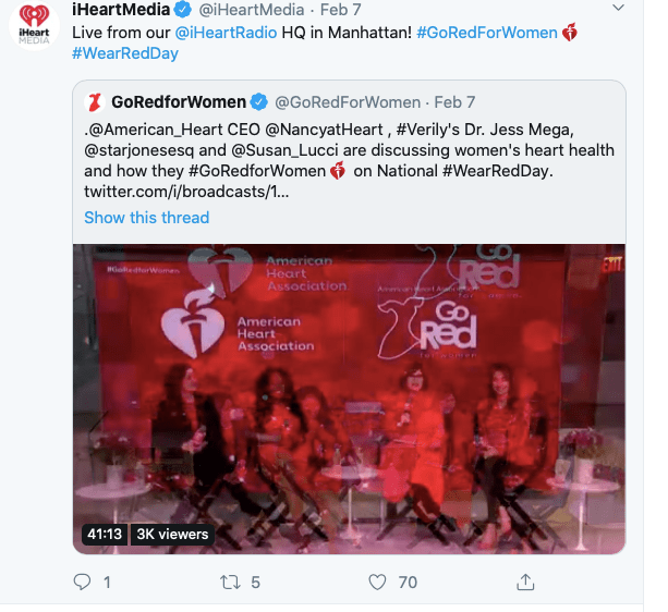 On iHeartMedia’s different platforms, you see mostly the same content posted on Facebook, Twitter and Instagram. They post frequently across all of their platforms, but you mostly see the same news and events on all platforms. For example, a post made in September of 2019, featuring a “#FQLounge” event can be found on Instagram and Facebook. You can also see the same post featuring the “#GoRedForWomen” campaign with the American Heart Association featured on twitter and Instagram. iHeartMedia posts them same content throughout all platforms to keep their social media content the same across all channels. Through doing this, iHeartMedia can keep their followers up to date on everything happening throughout the company, without having to check other social media sites. Everything they post seems to be important to the company, keeping all platforms relevant.