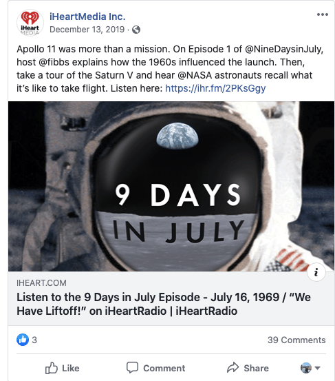 iHeartMedia does use their various platforms for selling. They promote various new stations, festivals and podcasts through their social media. As seen on their Facebook page on December 13, 2019, they promoted a new podcast episode about Apollo 11. Through the link, users can go directly to the podcast episode. Although users don’t need to buy the specific podcast, they are shown all features of the iHeartRadio app and can then decide if they want to upgrade within the app to get more benefits.