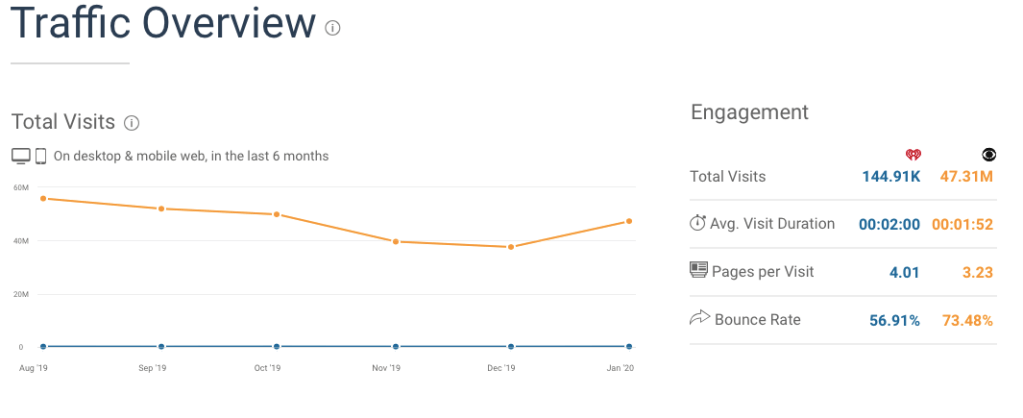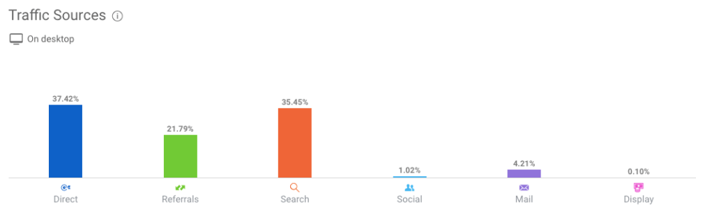 Another way to measure traffic on IHeartMedia.com was observing their traffic sources. It was shown that 37.42% were direct traffic and 35.45% were from a search engine. Social media came in at a low 1.02%, meaning their social media is not driving much traffic to their Web site.