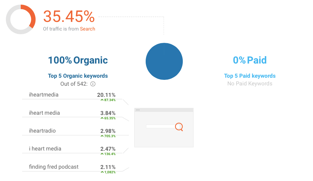Through engagement, you can also analyze keywords searched by users. It was shown that 100% of searches were organic and the top 5 organic keywords involved variations of iHeartMedia and iHeartRadio.