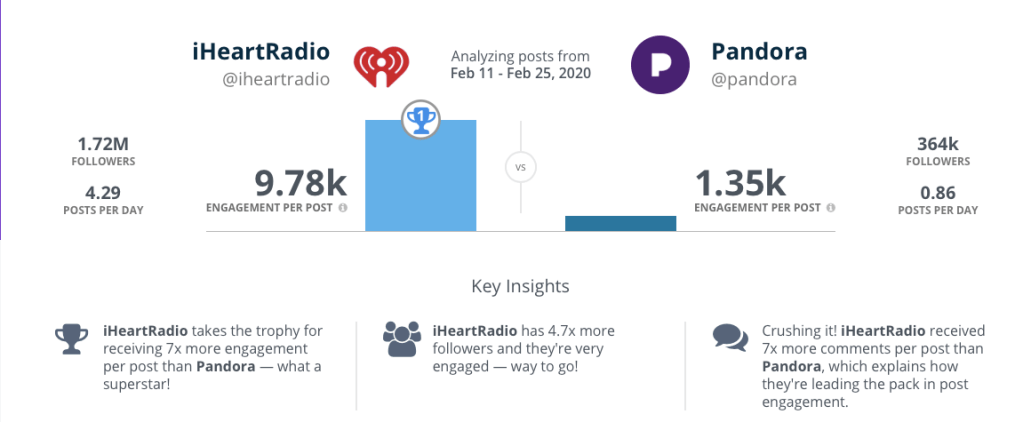 Engagement metrics for iHeartRadio were compared with Pandora on Instagram. iHeartRadio was shown to have 7x more engagement per post compared to Pandora and was shown to have 4.7x more followers. iHeartMedia also has 4.29 posts per day compared to Pandora’s 0.86 posts per day.